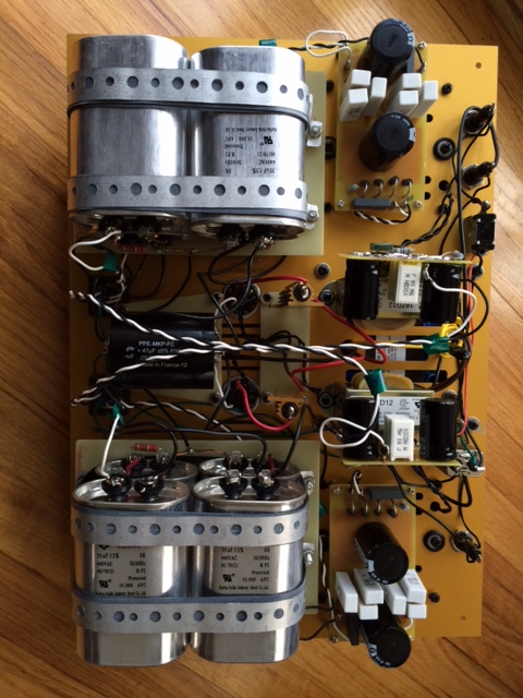 The wooden cabinet enclosure is exactly the same size like the amp one for a pleasant look.. Also the top plate is identical size ( 460x324mm) and same gold anodized 3mm aluminum from Proto Panel. However the PSU is much more heavier at 56 lbs compare to the amp. The inside available height is 120 mm allowing me to fit those huge Epcos polypropylene in oil motor run capacitors.