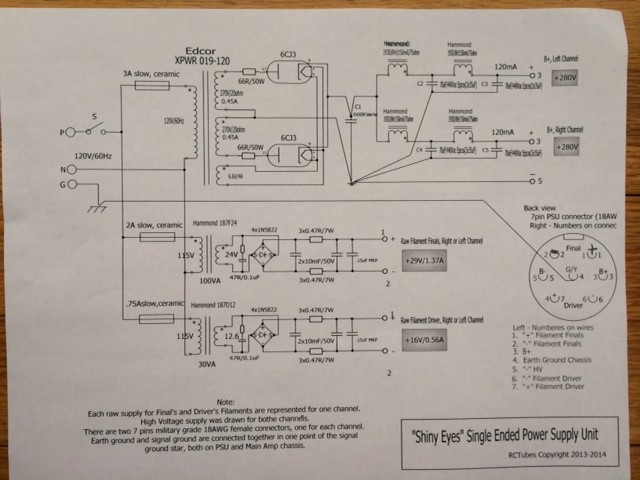 I chose Edcor main transformer XPWR019 as the closest option to what the design required. This is the reason I had to adjust the voltage by adding two power wirewound resistors before the rectifiers. The low voltage filament raw supplies shown in the schematics are for one channell. One must double that portion of the schematics. All transformers were selected with a margin of power reserve, therefore the PSU unit is running cold ( slightly warm) except for the rectifier tubes. Wiring the ground must be done with great care. Schematic shows a idea of running the ground earth and signal.