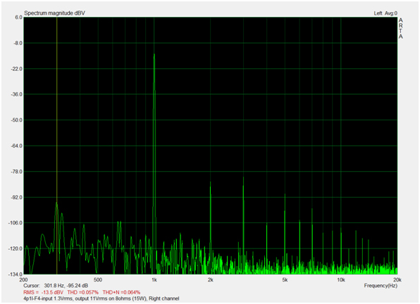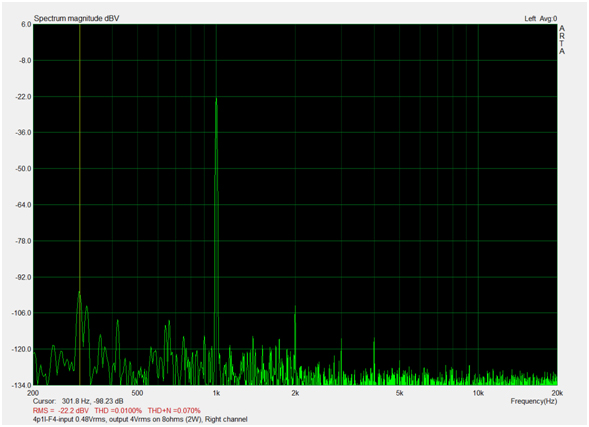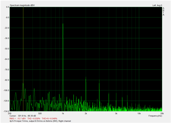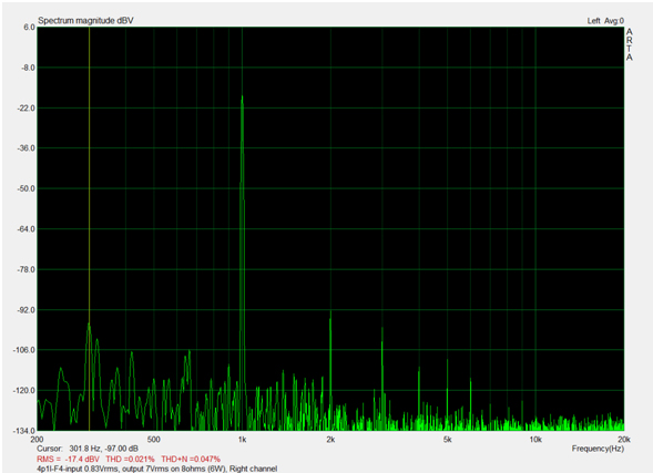 The following measurements are only to give you a sense  of the approximate performance. I used a computer software and interface and this comes with some artifacts and noise that are not present when the amp is connected in a audio path. One, if possesses a higher quality audio analyzer, can take more precise measurements.