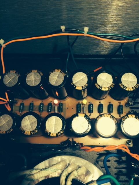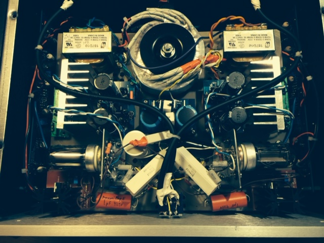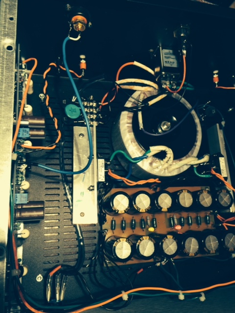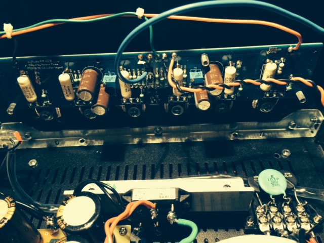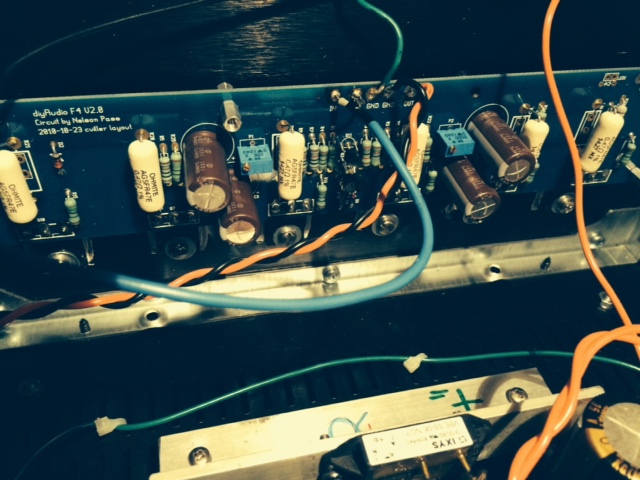 F4 was designed by Nelson Pass. As many people have started, I thought I was building it for myself as all the reviews and description were convincing. I am a tube guy and I thought that I am going to bring a little solid state spice in my audio life. This amp sounds excellent as described by Nelson Pass. I built the F4 with extreme love and care. I’ve selected the best parts for it. The enclosure is very good quality, Italian made, HIFI2000 Standard 4U amp classic bought at DIY Audio store. The F4 clone PCBs are very good quality and came from the same store. Coupling capacitors are Elna RFS Silmic II and PS capacitors are 10mF/35V Nichicon KG Gold Tune ( total of 12, 6 for each supply). All resistors are excellent sounding Takman REY, except for the 0.47 ohms/5W which are Ohmite Audio Gold wirewound. Rectifier bridges are XFRED 68A/600V. Power transformer  is Antek 2218 (200VA/18 V dual). Main switch is anti-vandal (mod-smart.com) 250vac/5A purple ring LED illumination 12V. Power MOSFET were carefully selected and paired, and were attached to the main heatsinks using mica insulators and ceramic thermal compound. The amplifier was tuned-up to the manual specifications ( .43A per power MOSFET and very low DC offset on the outputs ( around 1mV)) and runs warm( you will have no problem touching the heat sinks).