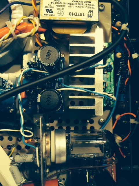 The preamplifier part was built on a 1/8″ FR4 board. The preamp is powered by three transformers ( toroidal for HT and two dual bobbin for filaments).  Coleman filament regulators are used. The preamp is coupled to F4 by a quality Dynamicap E 1uF capacitor. All components were selected with great care. Alps stereo potentiometer is used for volume control.