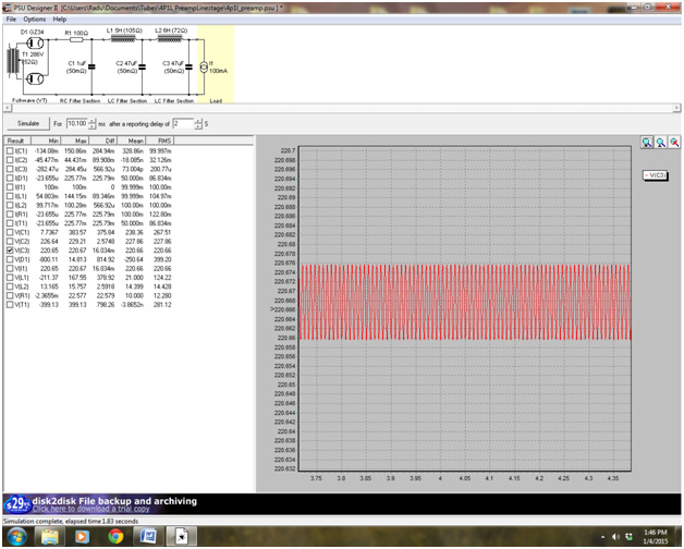 The power supply unit is a redesigned (repurposed) one. It uses Hammond 270Ex for main HV in a quasi choke input 1uF(ClarityCap)-5H(150mA-105ohms)-47uF(SolenFast)-6H(150mA-72ohms)-47uF(SolenFast). Here is the PSUD2 result:4P1L_Pre_PSU_1-2015