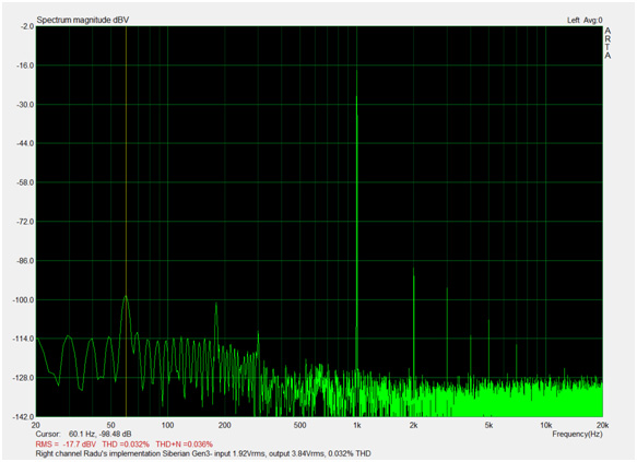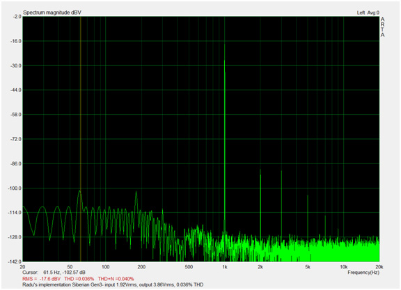 • THD at 3.84Vrms output : lower than 0.1% depending on the tube ( best at 0.02%0 in this case about0.038%)