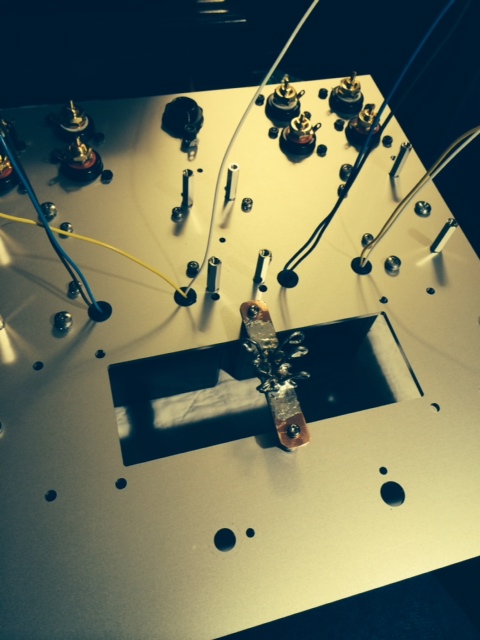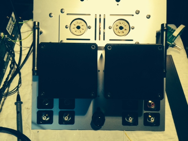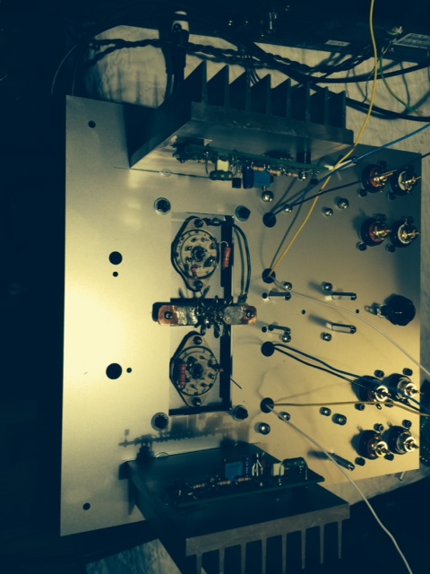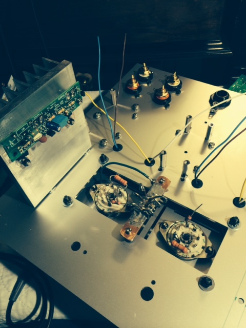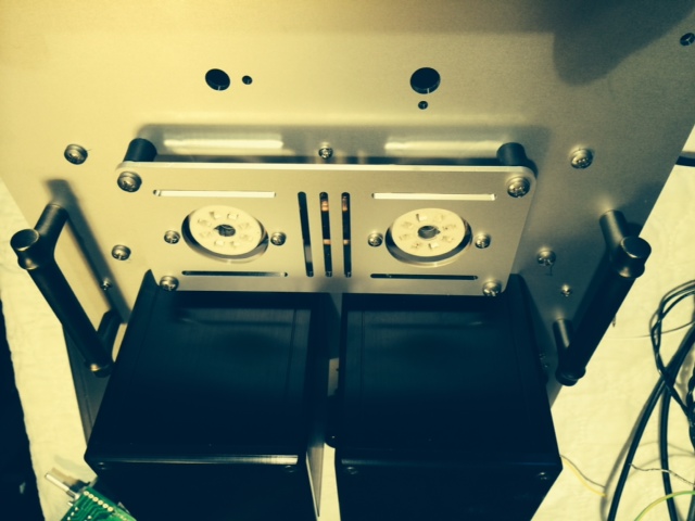 I believe the result is satisfactory.  There is a main top plate that has all equipment attached to, and a small aluminum plate that holds the tubes and is attached to the main plate through 4 neoprene vibration damping sandwich mounts. The tube sockets are attached to the tube plate through rubber grommets. In addition each tube has 2 rubber rings installed. All the measures listed above result in lowering the micro phonic effect that 4P1l is prone to. Another challenge was securing the remote IR diode.