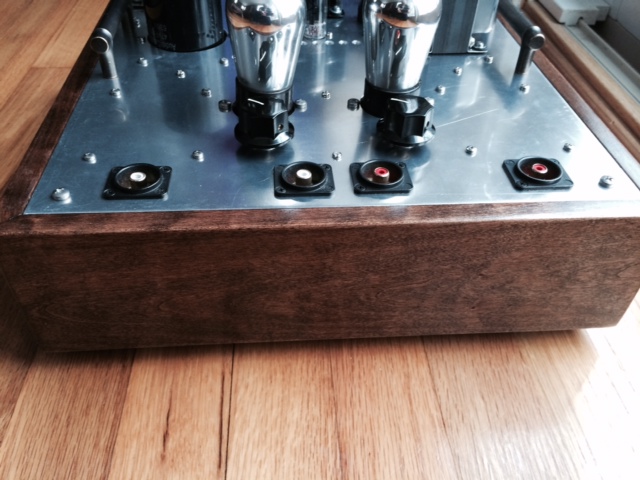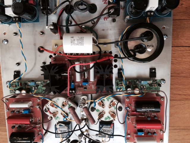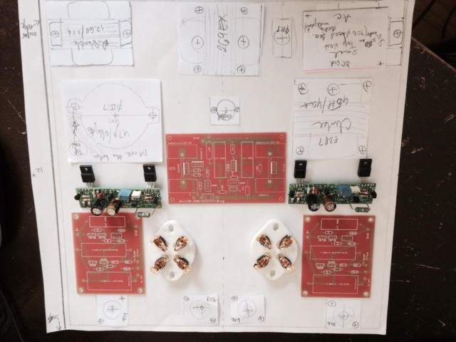 I designed the layout as always preferred ( when there is no issues with complete screened enclosure) : one top plate ( Aluminum 1/8″) that has all the components attached to, and one wooden enclosure. In this case there are no heat management issues so I had to drill less holes on the top plate. Usually I like to use Front Panel Express to order the top plate ( for a more professional look and easy to assembly)..this time I just draw it in CAD and printed out to use for exact drilling locations. The top plate is standard 12″x12″( McMasterCarr) and consequently the wooden case is 13″x13″x3.5″.