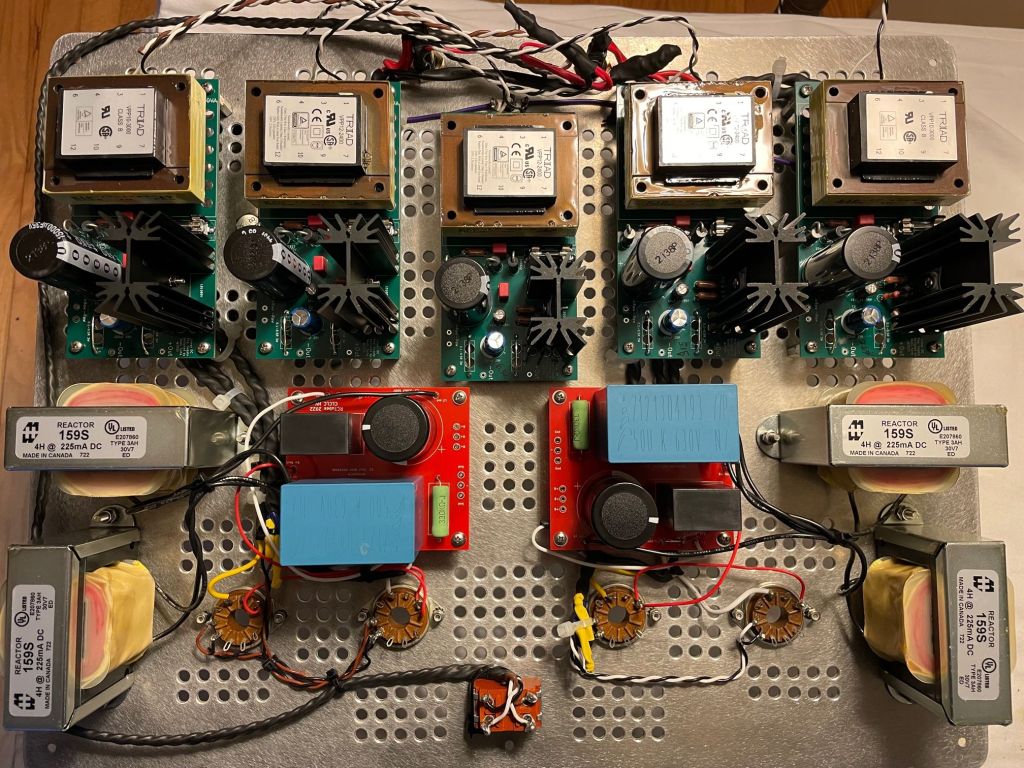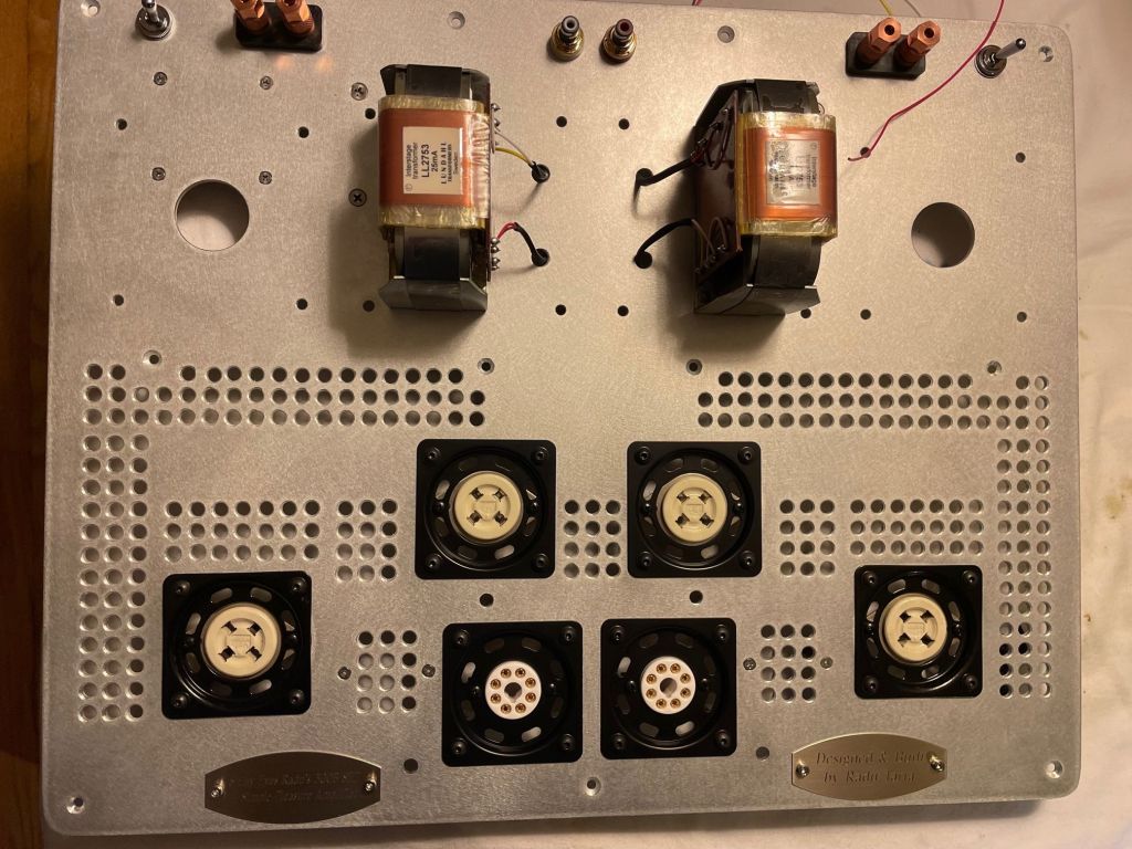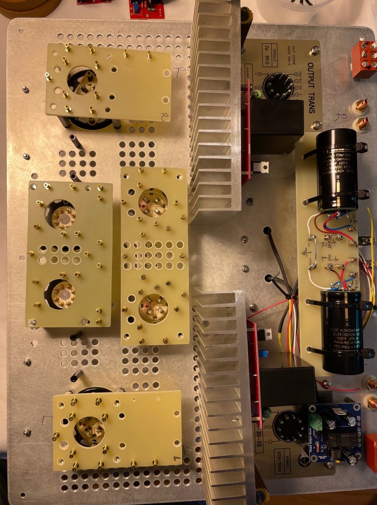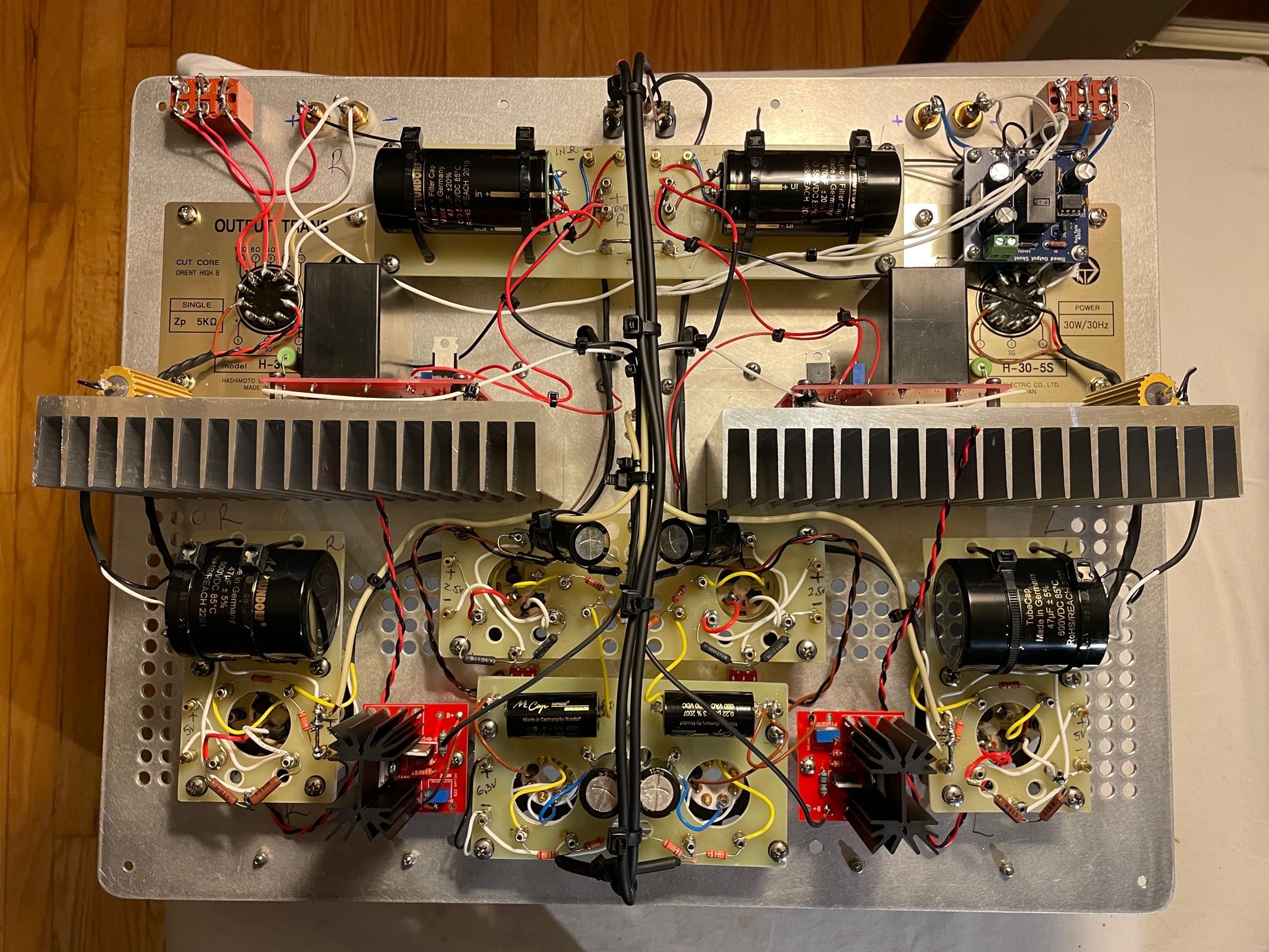 The power supply is dual for the high voltage ( see two toroidal 200VA transformers and two sets of 6CJ3 rectifiers) having a CLCLC filtering using 4 pole Mundorf HV+ capacitors. There are 5 independent low voltage regulated supplies to provide power to all filaments. Therefore the umbilical cords are carrying DC only. The way is designed this amp is super quiet.