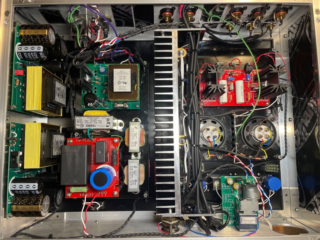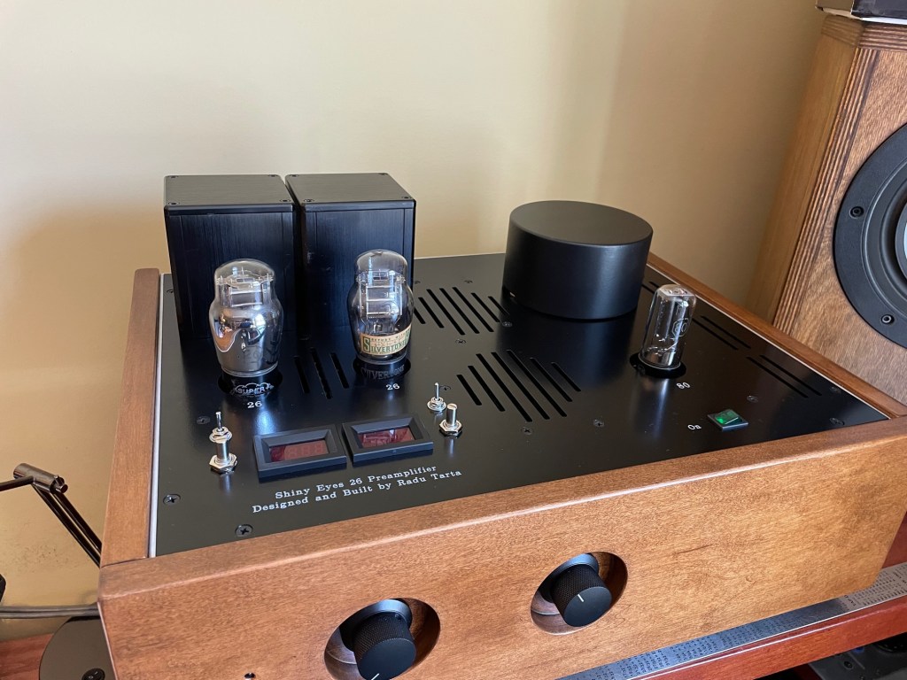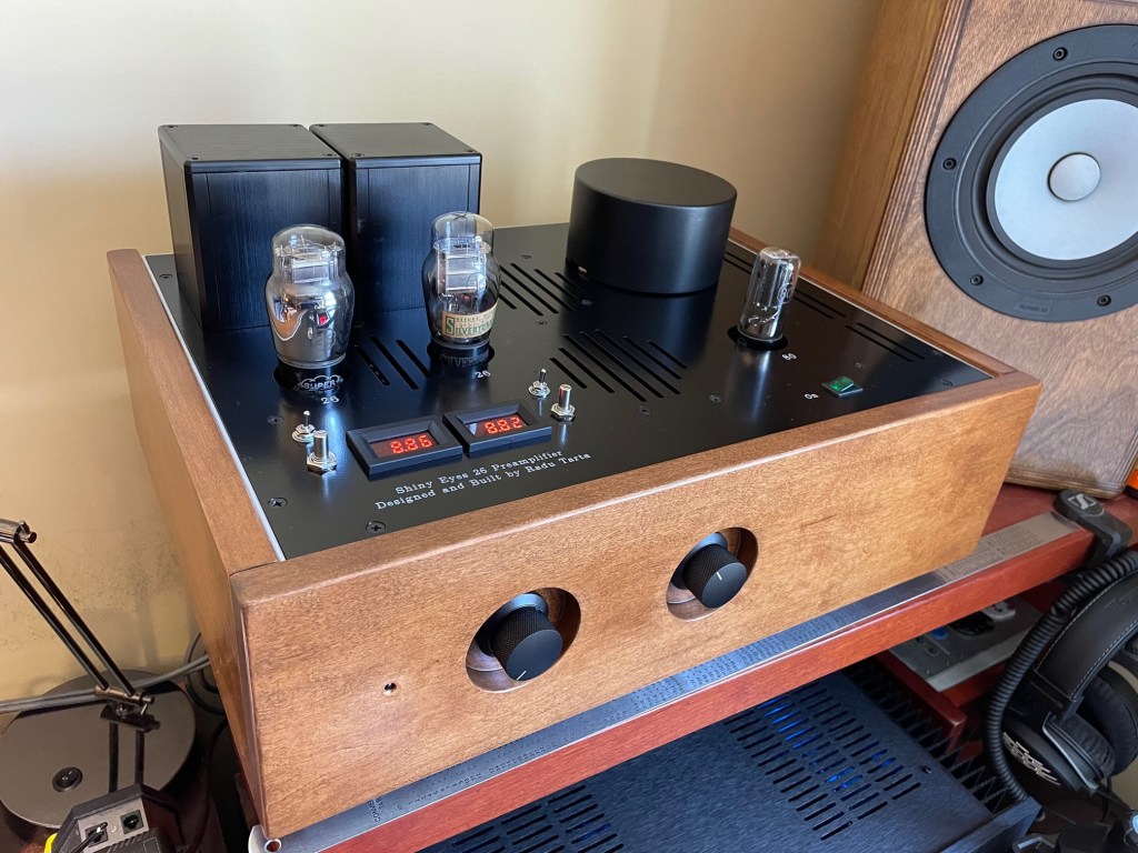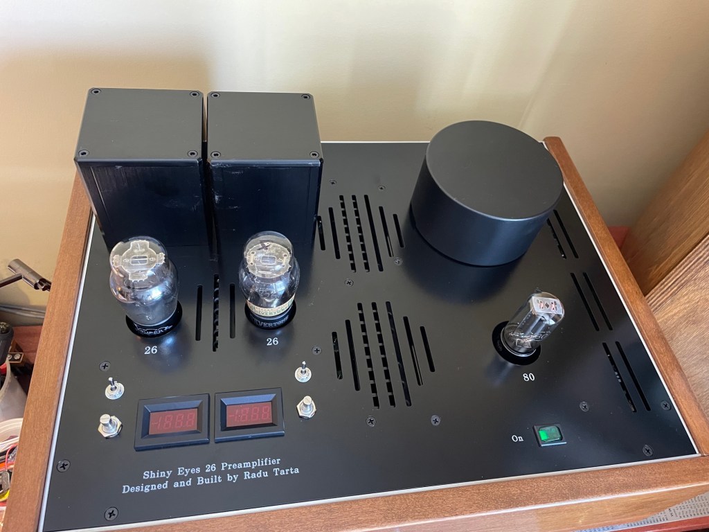 At the demand of the client, the preamplifier was carefully designed in one enclosure. Despite the challenges of a single enclosure DHT preamp, the 26 device is as quiet and as little microphonic as possible. 26 tube is known for picking up noise/hum from proximity to the AC radiating area. I highly recommend a dual enclosure scenario, with a separate power supply. However, if used with low power tube amps that have low to medium overall gain, this preamp will perform great.