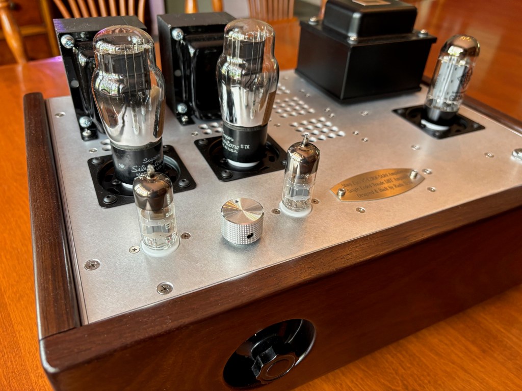 It features Jack Elliano’s Electra Print output transformers with partially silver secondary. It plays in good synergy with the 45 tube. The driver is either E280F or D3a. It is a capacitor coupled to the power stage.