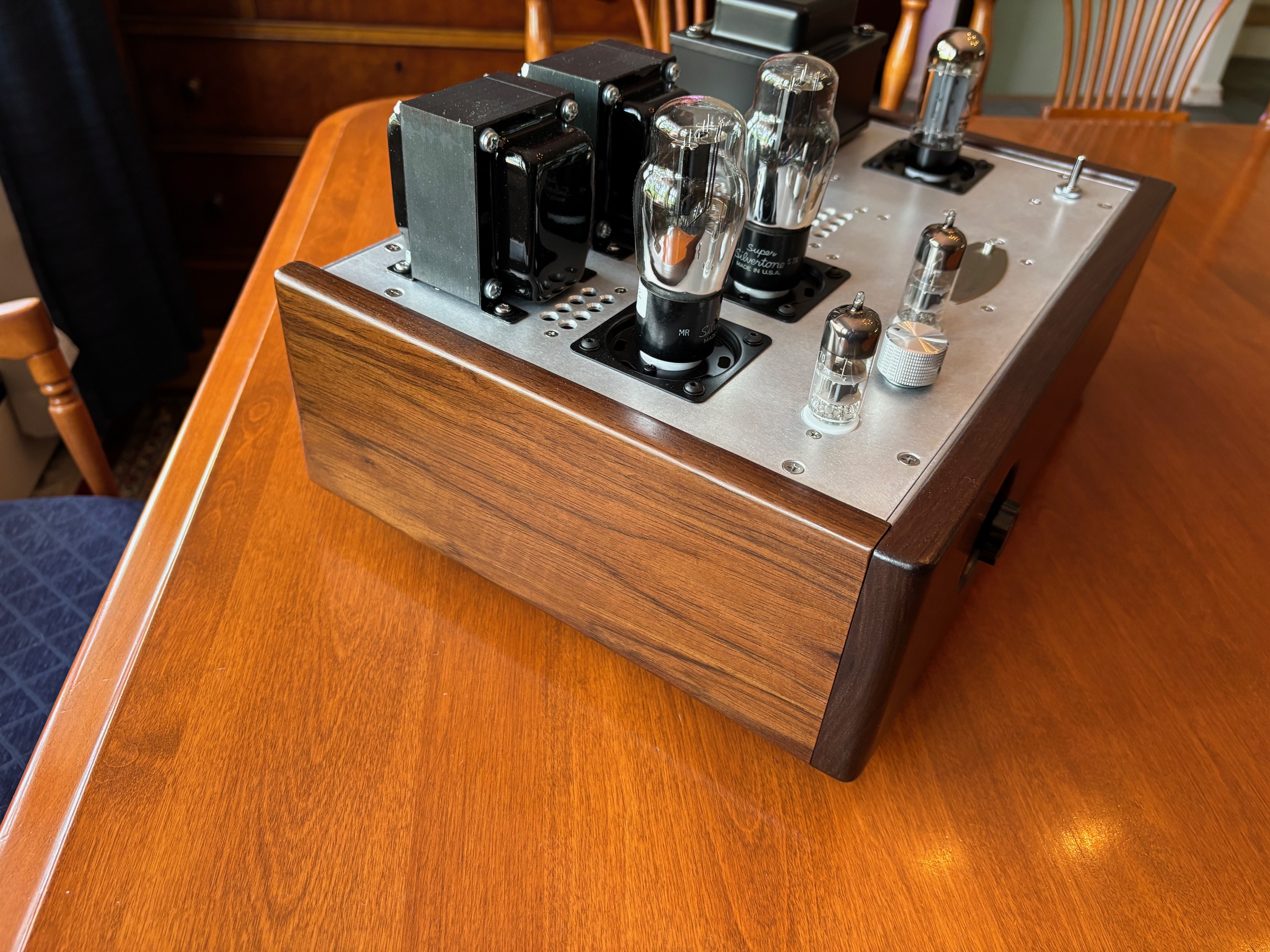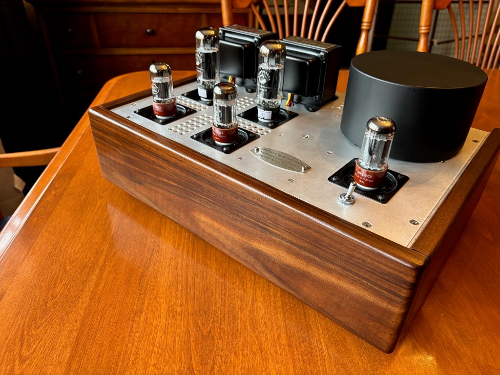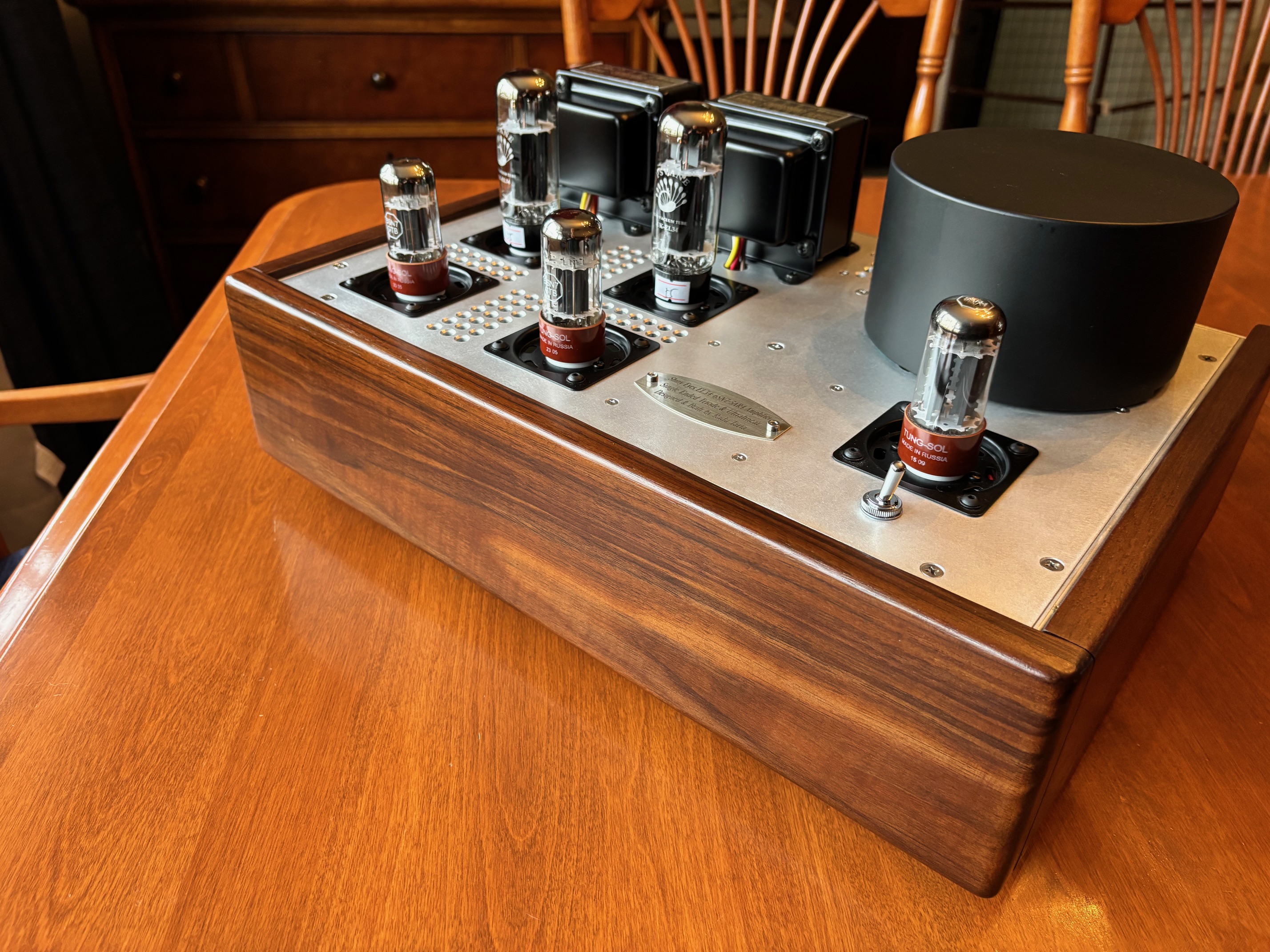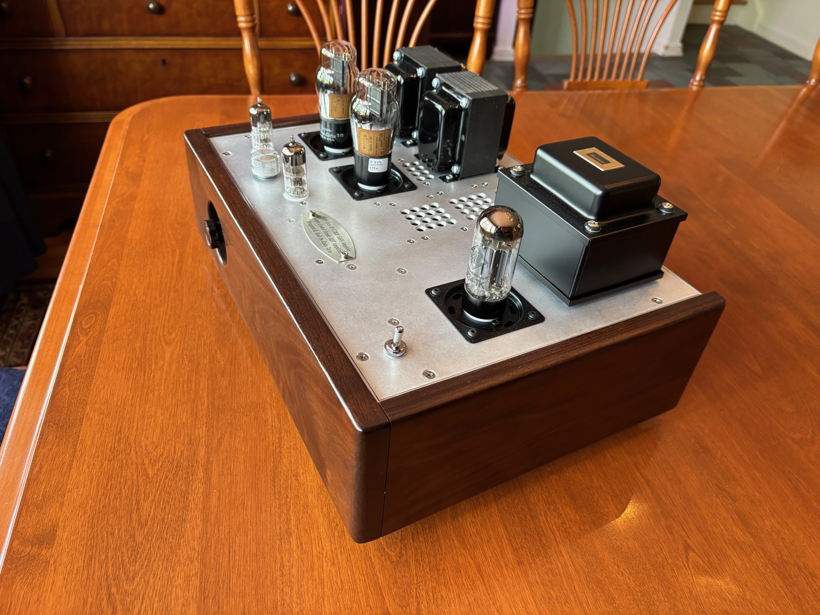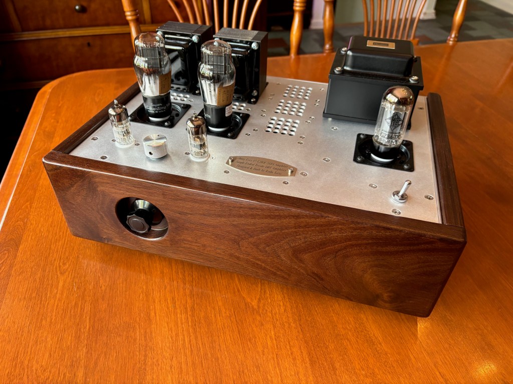 The amp is built in a very sturdy aluminum chassis from Dave at Landfallsystems, with front and sides wrapped in Peruvian walnut. The top plate is CNCed at Front Panel Express. The amp dimensions are 19x14x9 (WXDXH), and weigh about 51 lbs.