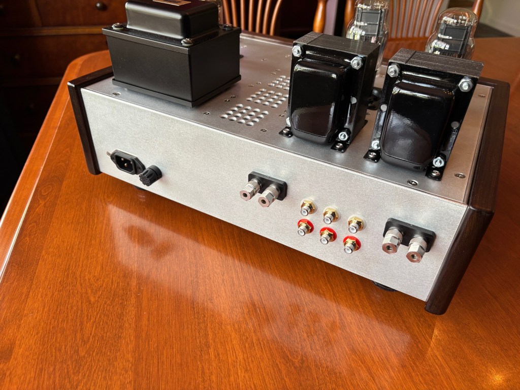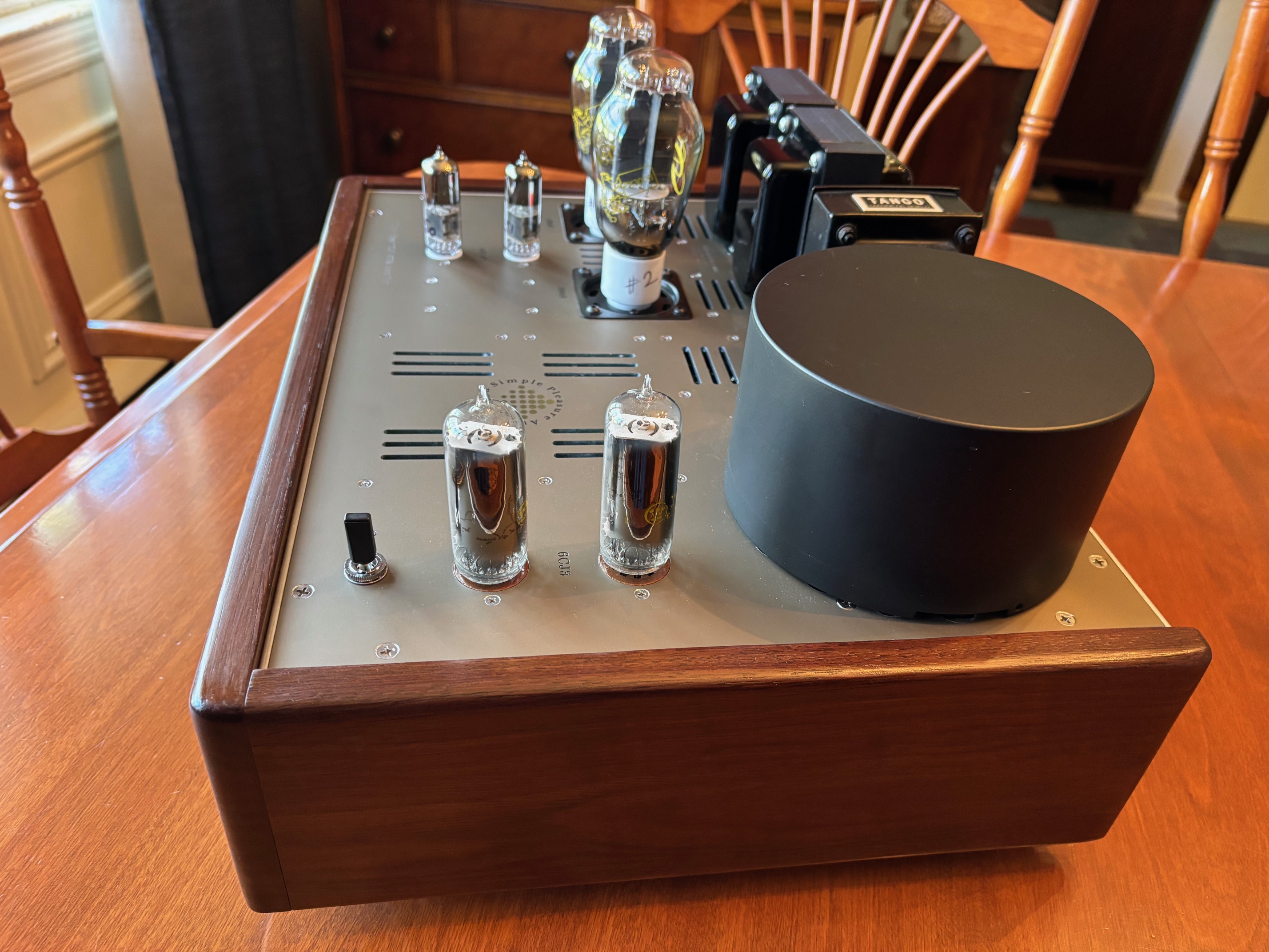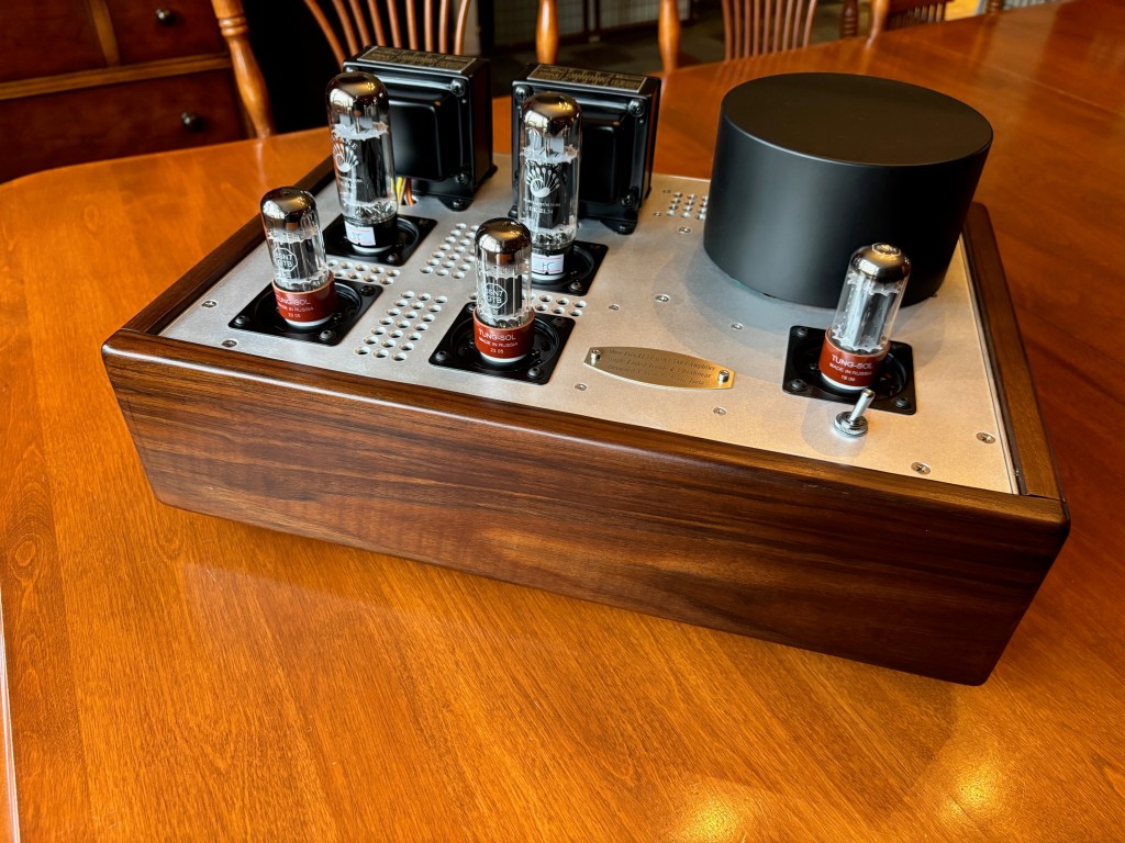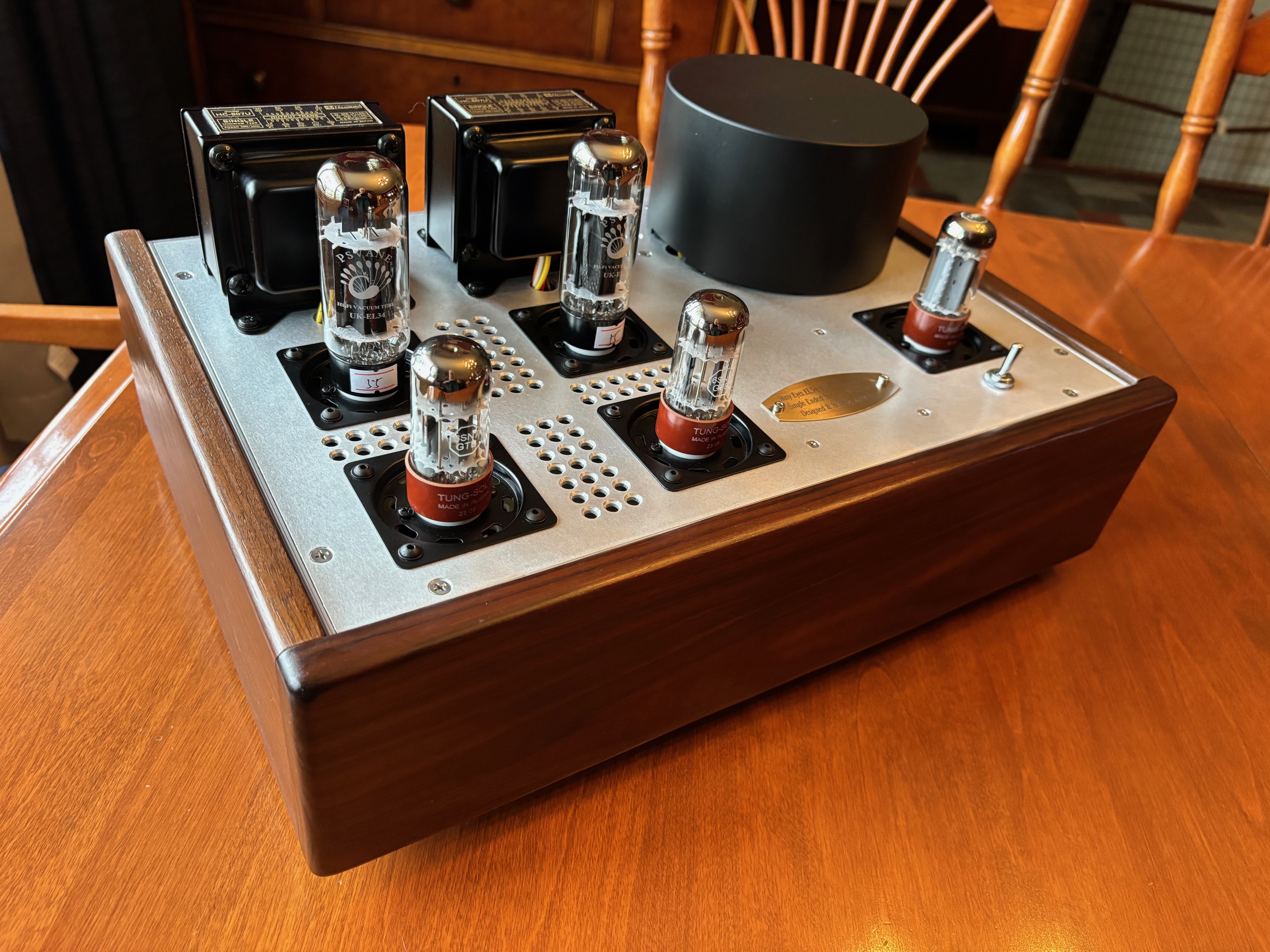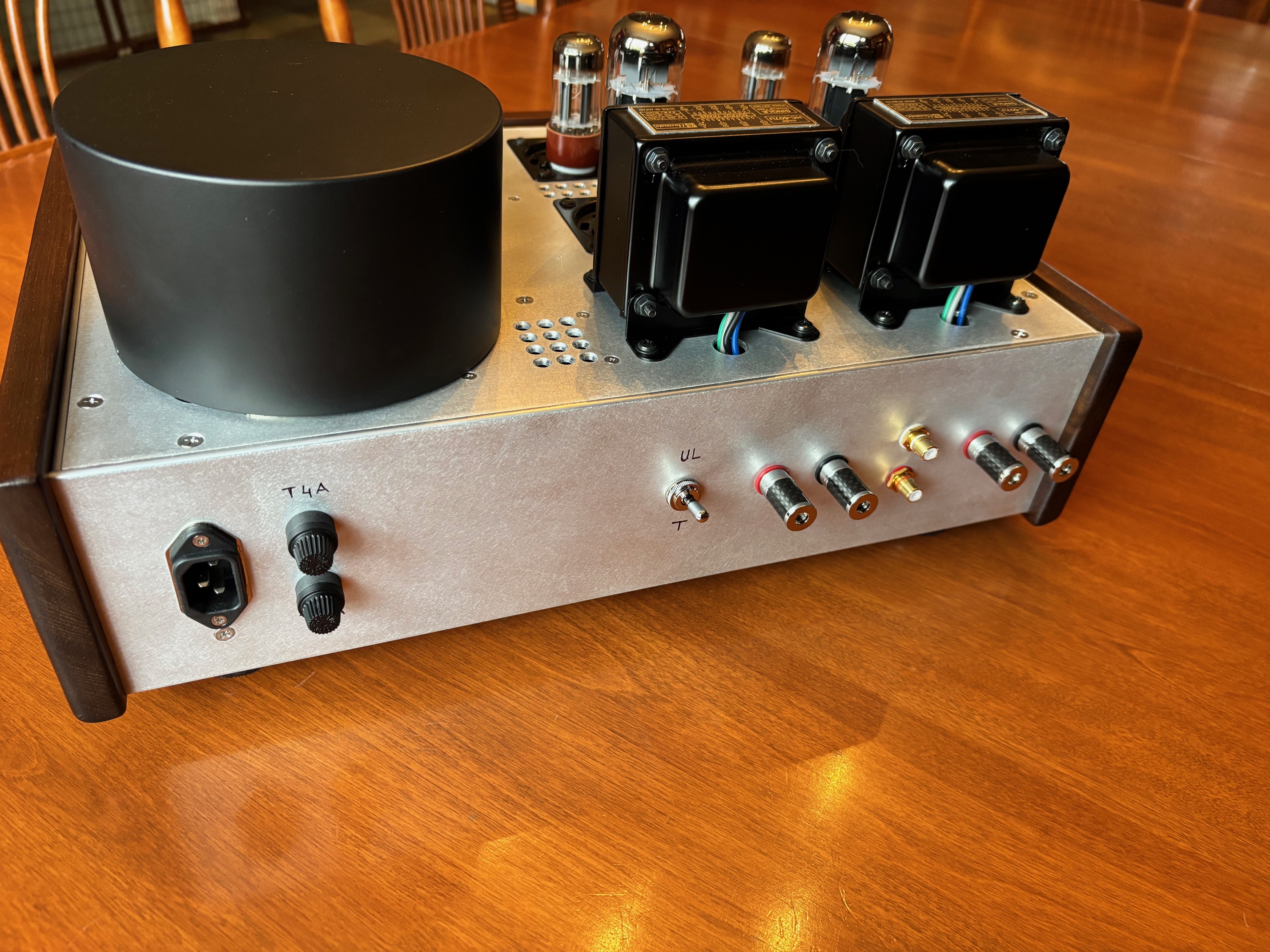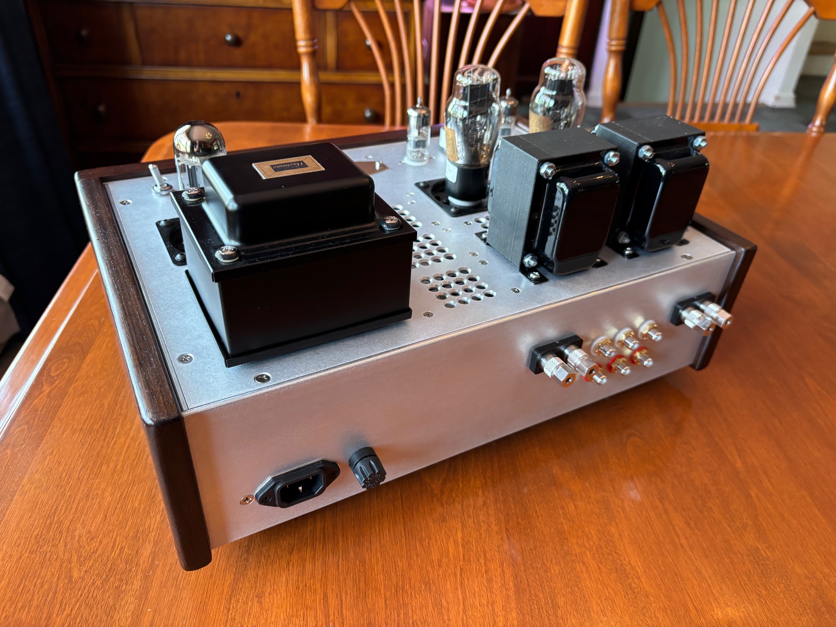 The amp is built in a very sturdy aluminum chassis from Dave at Landfallsystems, with front and sides wrapped in Peruvian walnut. The top plate is CNCed at Front Panel Express. The amp dimensions are 19x14x9 (WXDXH), and weigh about 51 lbs.